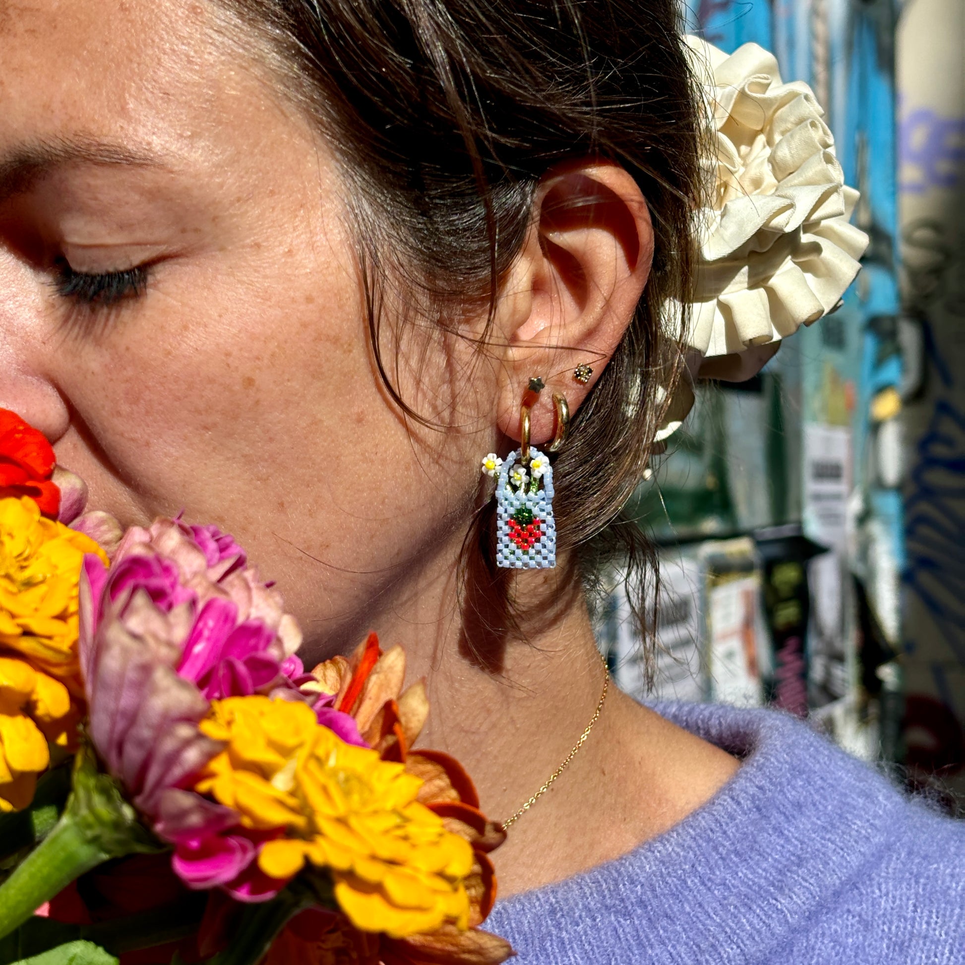 🇬🇧 If you're a fan of miniatures like me, you'll love my tiny beaded bags with a strawberry motif filled with little daisies