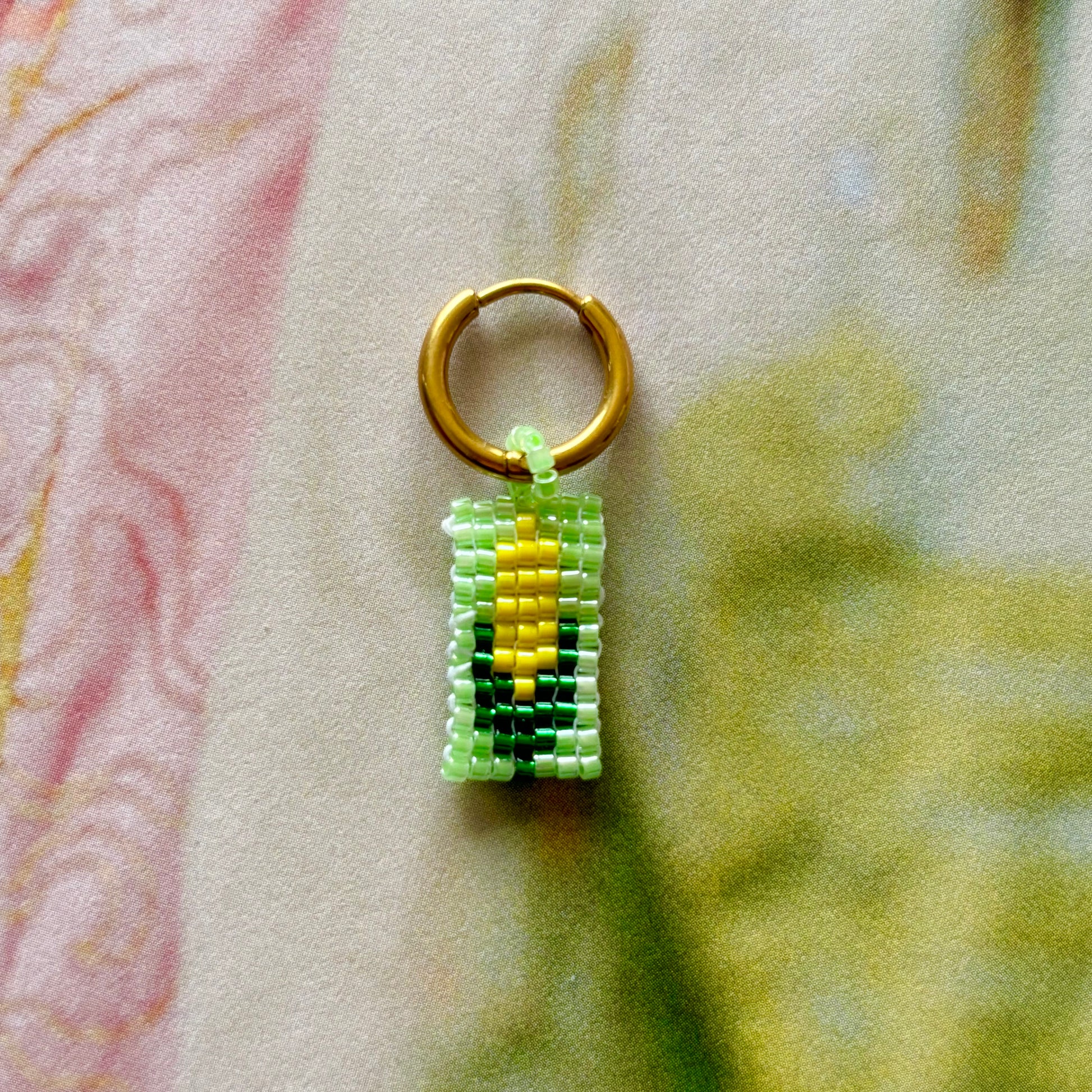 Charm en perles Miyuki (petites perles en verre japonaises) et créole en acier inoxydable doré à l'or fin 18K. Votre bijou est solide et durable s'il est traité avec amour.