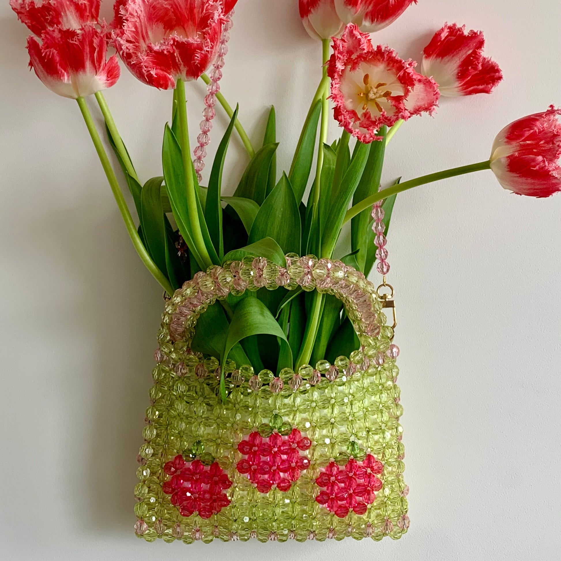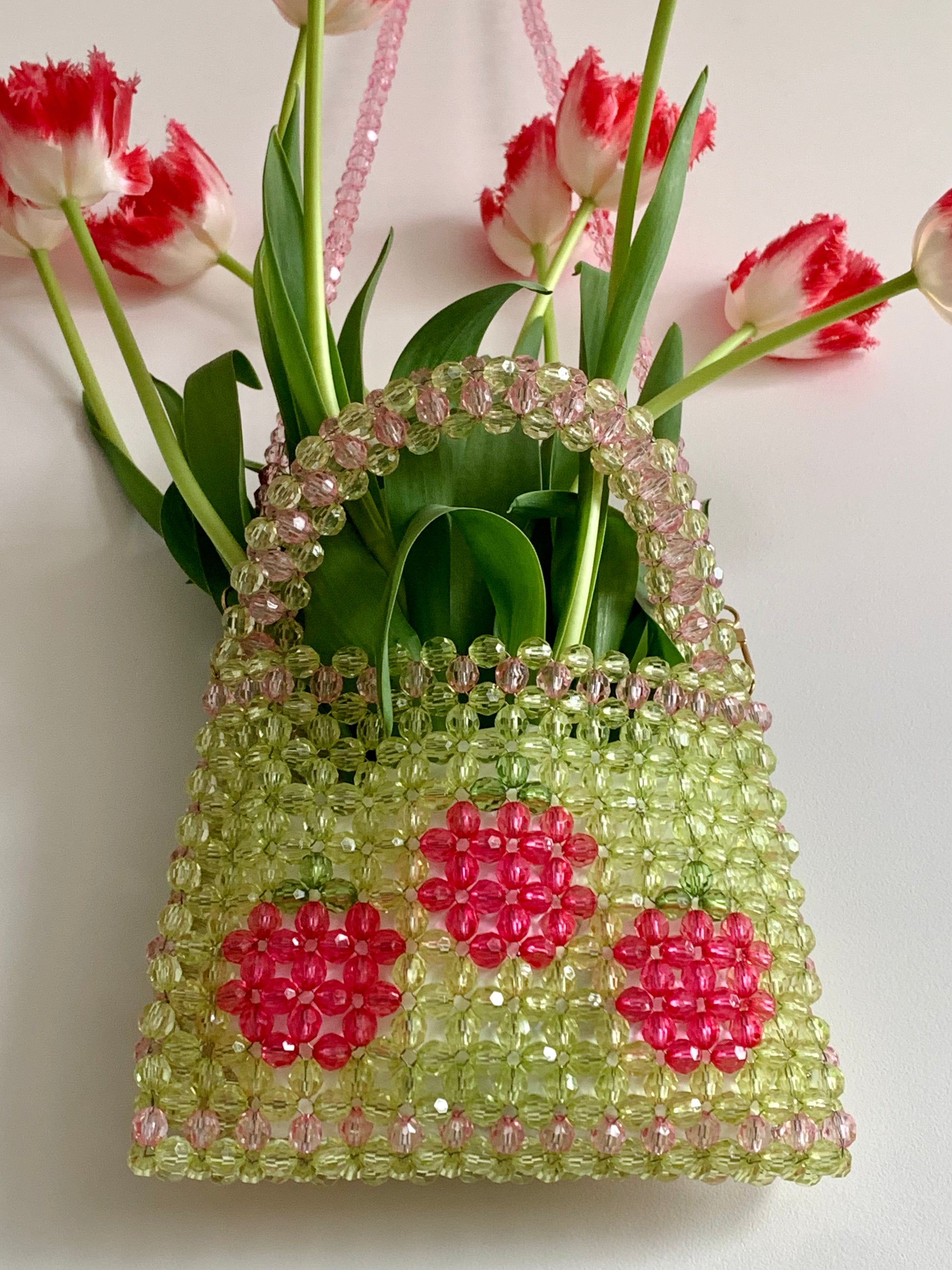 Le sac à main de tes rêves, fabriqué entièrement à la main dans mon atelier parisien, en perles acryliques acidulées. Avec sa poignée et sa bandoulière amovible en perles ornée de sa petite framboise en perles Miyuki.