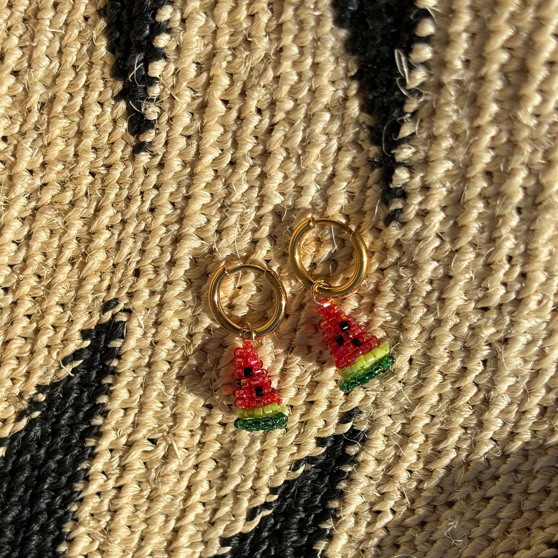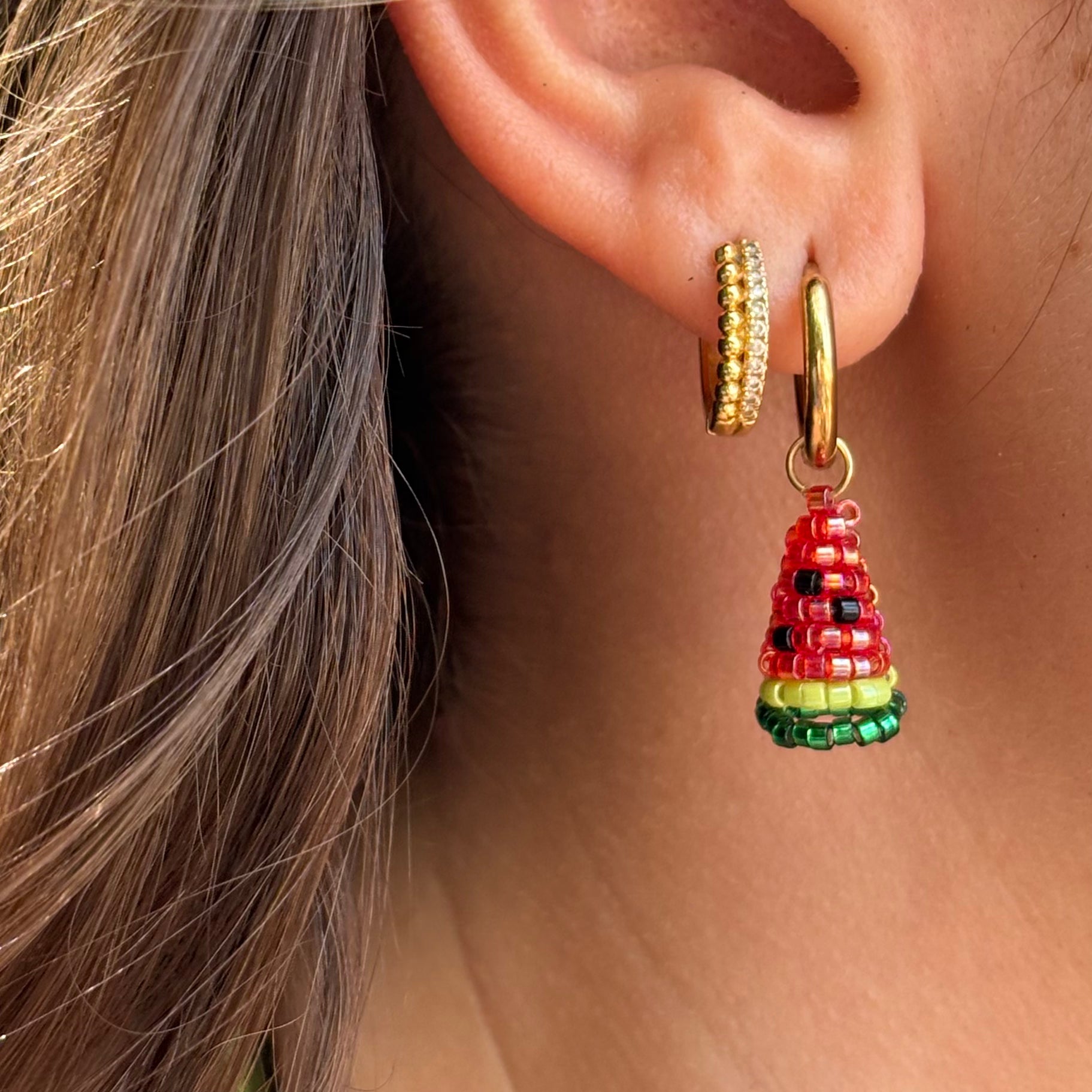 Petite créole en acier inoxydable doré à l’or fin ornée d’une petite pastèque en perles Miyuki (perles en verre japonaises) fabriquée à la main dans mon atelier parisien pour un look frais et vitaminé !
