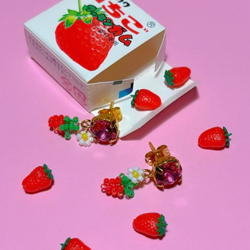 Clous d’oreilles en laiton doré à l’or fin 24K (épaisseur du plaquage 0.3 microns) sertis de chatons 8mm en cristal de la marque PureCrytsal fabriqués en Europe. J’y ajoute mes petits fruits ou légumes en perles Miyuki (petites perles en verre japonaises) qque je fabrique entièrement à la main dans mon atelier parisien.