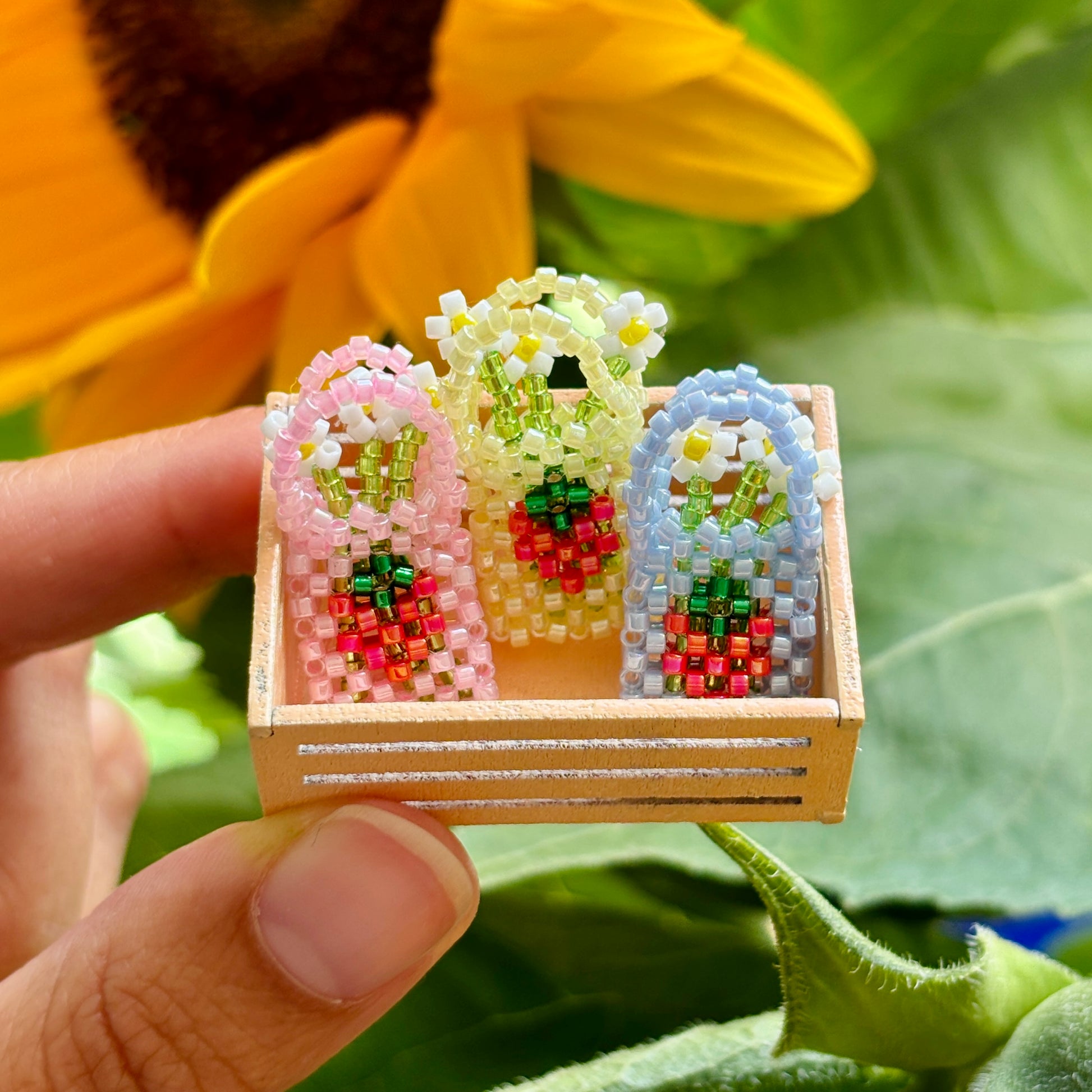 Si vous êtes une fan de miniatures comme moi, vous allez craquer pour mon tout mini mini sacs en perles au motif fraise rempli de petites pâquerettes 🌸